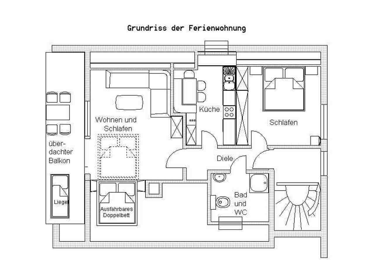 ist für 2-5 Pers. geeignet und hat 70 qm Grundfläche (nach DIN 50 qm). Die Wohnung hat 1 Schlafzimmer mit Doppelbett und einem Beistellbett wenn nötig, Ein sehr großes Wohn- Schlafzimmer mit zwei ausziehbaren Betten auf Rollen, eine Wohnküche mit Tisch, Eckbank und Spülmaschine ist komplett eingerichtet. Ein Bad mit Dusche und WC und Föhn. Auf der Südseite befindet sich ein sehr schöner, großer, überdachter Balkon, mit wunderschönem Ausblick.
